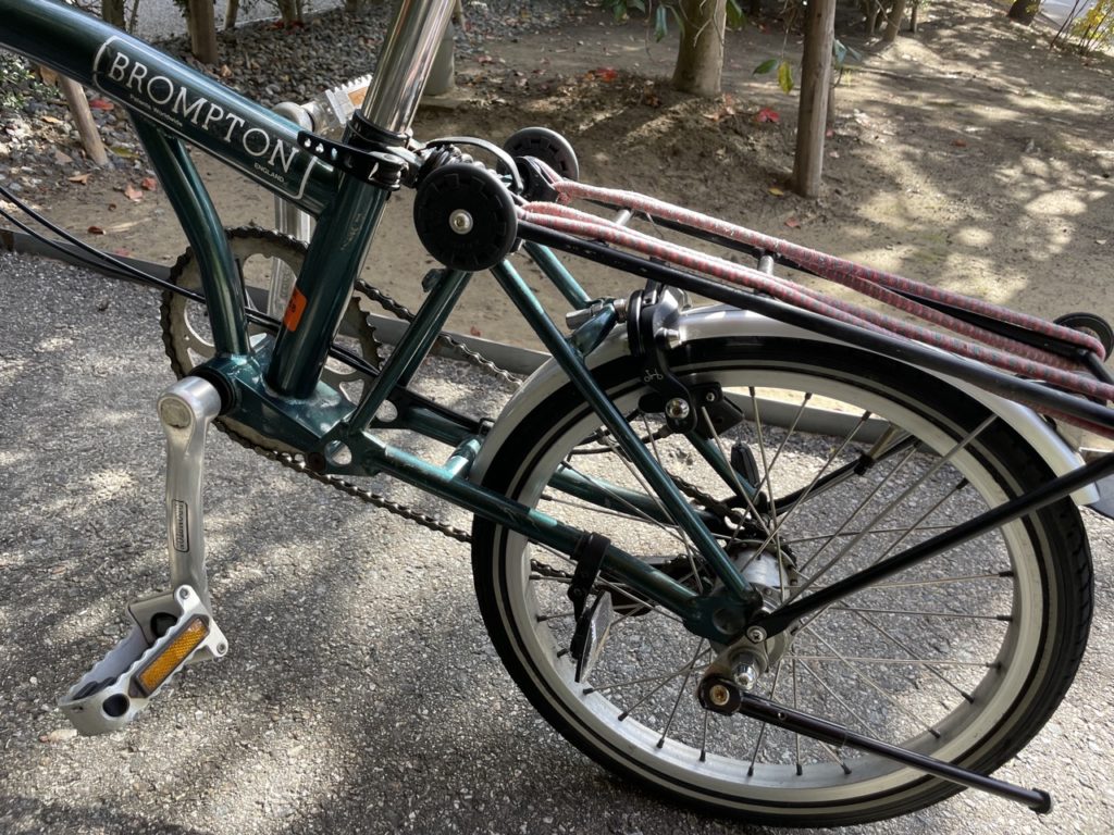 サドルの表面の剥がれが進んで交換。サドルは純正を革製に変える人がかなりいるからだろう,メルカリで純正品が3000円くらいで新品に近いものが入手できた。英国製ブロンプトンのマークが入っているので,英国偽装車体っぽくなる。
